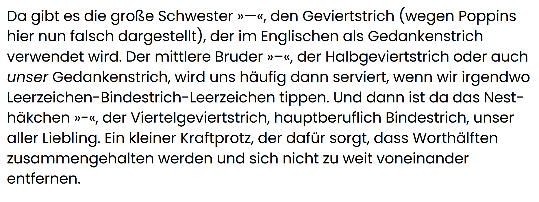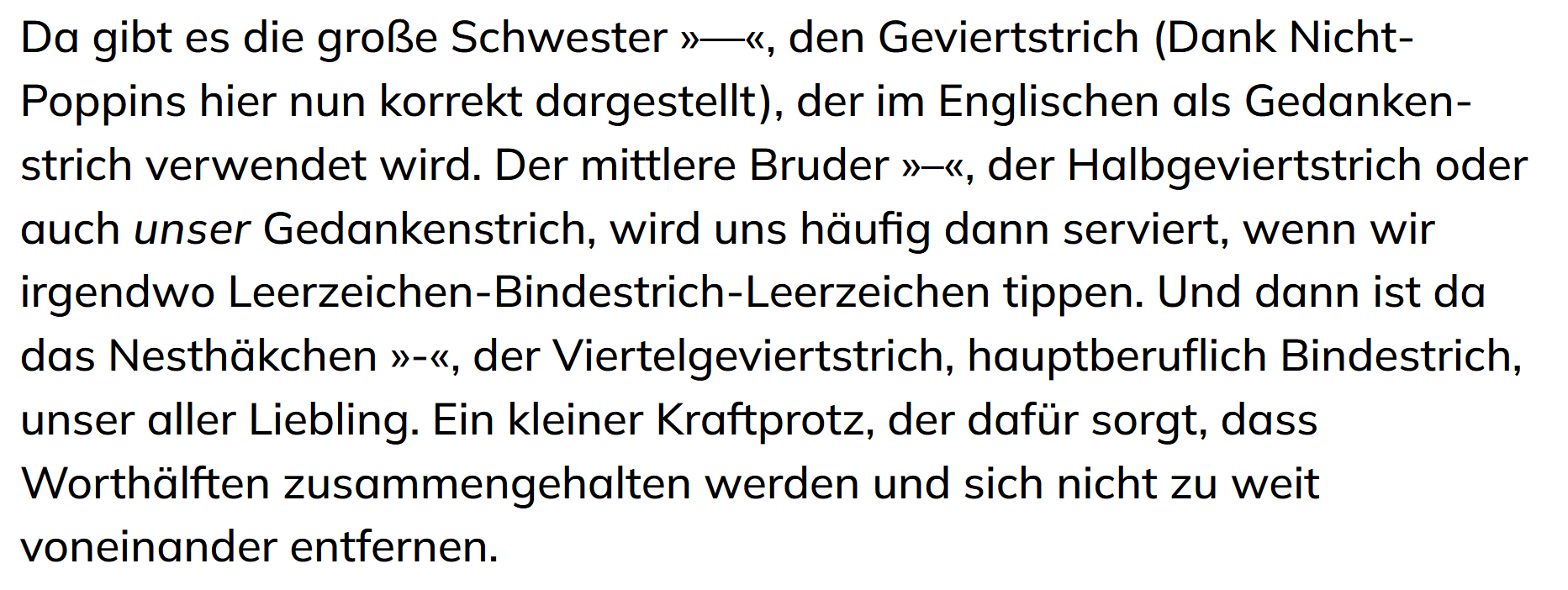 Da gibt es die große Schwester »—«, den Geviertstrich (Dank Nicht-Poppins hier nun korrekt dargestellt), der im Englischen als Gedankenstrich verwendet wird. Der mittlere Bruder »–«, der Halbgeviertstrich oder auch unser Gedankenstrich, wird uns häufig dann serviert, wenn wir irgendwo Leerzeichen-Bindestrich-Leerzeichen tippen. Und dann ist da das Nesthäkchen »-«, der Viertelgeviertstrich, hauptberuflich Bindestrich, unser aller Liebling. Ein kleiner Kraftprotz, der dafür sorgt, dass Worthälften zusammengehalten werden und sich nicht zu weit voneinander entfernen.